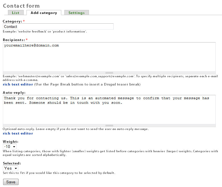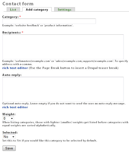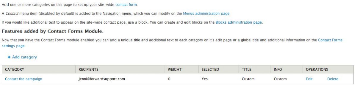 On this page you can "add category", which creates a new contact form. You can also click on "Contact form settings page" to change the settings for this form.