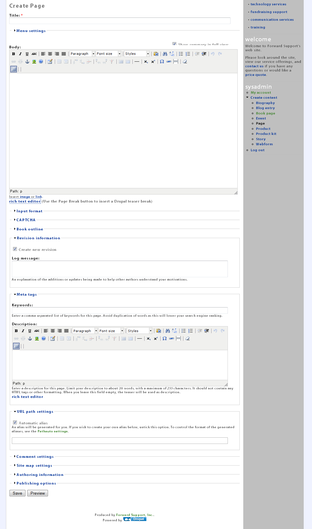 Fill out the information on the page and then scroll down. You may see additional options that you can expand to change things such as the URL for the page (so you could have www.example.com/about_us as the address instead of www.example.com/node/24).