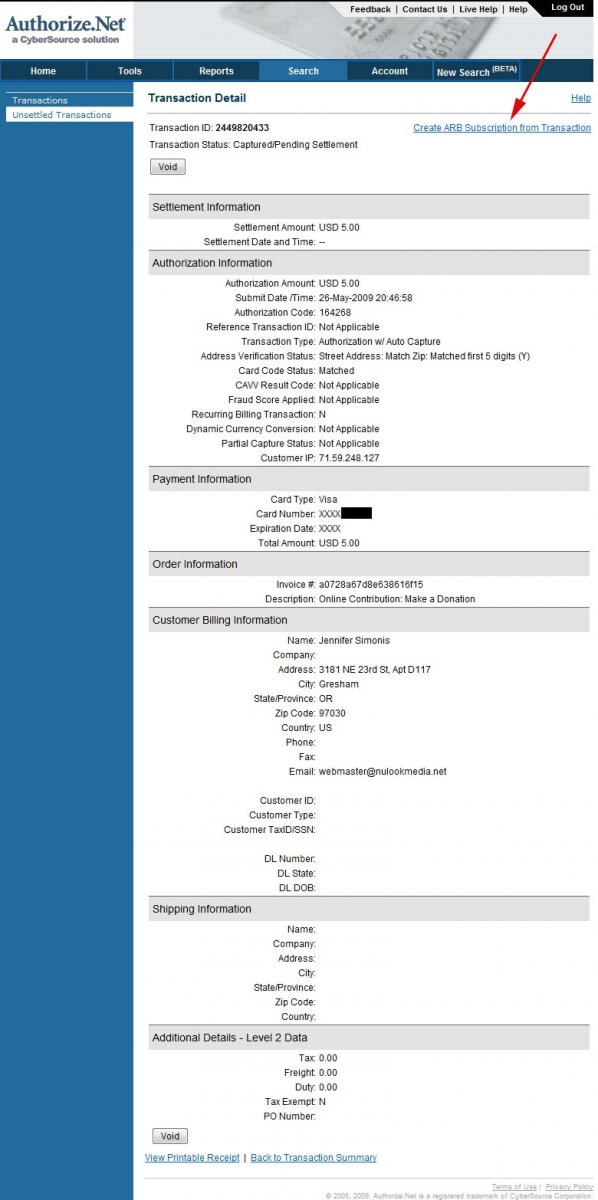 On this page, you will click "Create ARB Subscription from Transaction" to create the recurring transaction.