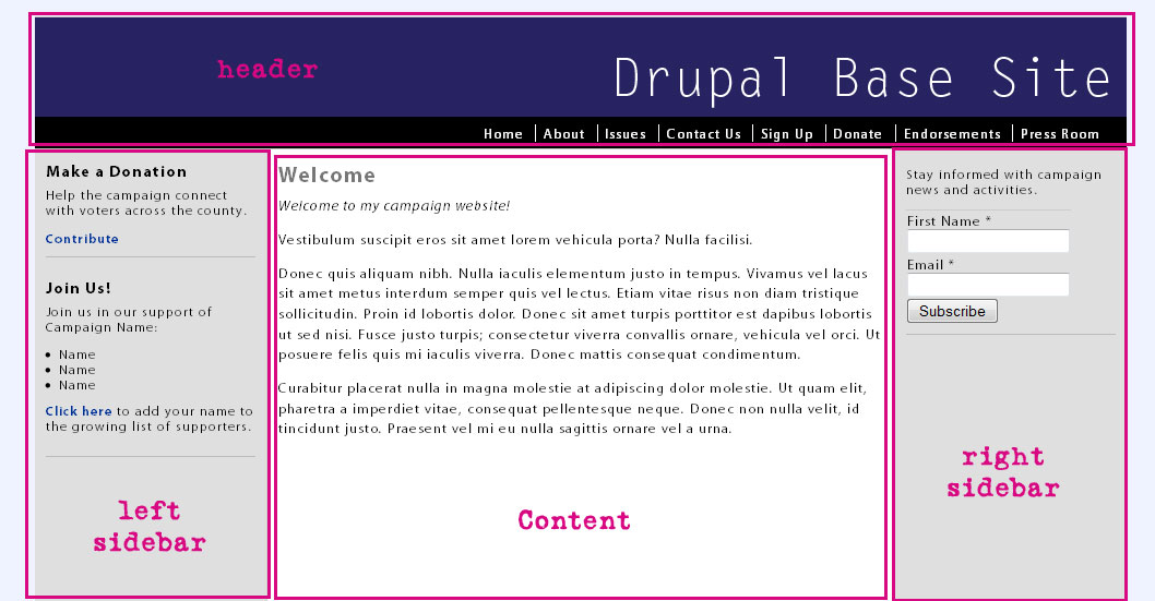 Pages in Drupal are often times set up in the common three column with header layout: